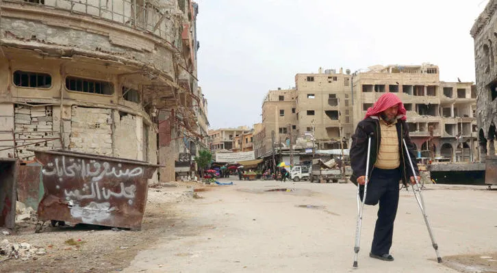 رجل سوري مصاب في قدمه.. يعبر صندوق قمامة كتب عليه «صندوق انتخابات مجلس الشعب» في إشارة إلى الانتخابات التي جرت أمس (إ.ف.ب)
