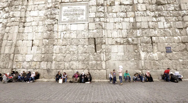 سوريون يجلسون إلى جدار الجامع الأموي في القسم القديم من العاصمة السورية دمشق (أ.ف.ب)