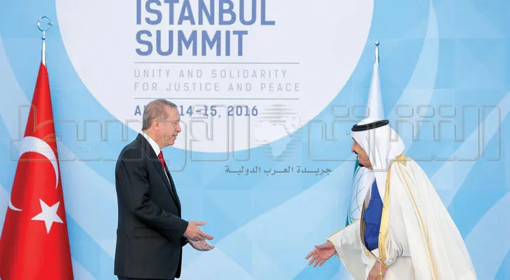 الرئيس التركي رجب طيب إردوغان مرحبا ومحتفيا بخادم الحرمين الشريفين الملك سلمان بن عبد العزيز في مقر القمة الإسلامية بإسطنبول أمس (تصوير: بندر الجلعود)