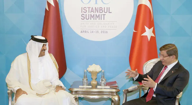 رئيس الوزراء التركي داوود أوغلو خلال استقباله الشيخ تميم بن حمد آل ثاني أمير قطر (غيتي)