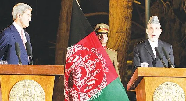 الرئيس الأفغاني حميد كرزاي وجون كيري وزير الخارجية الأميركي خلال المؤتمر الصحافي بينهما في العاصمة كابل أول من أمس (أ.ب)