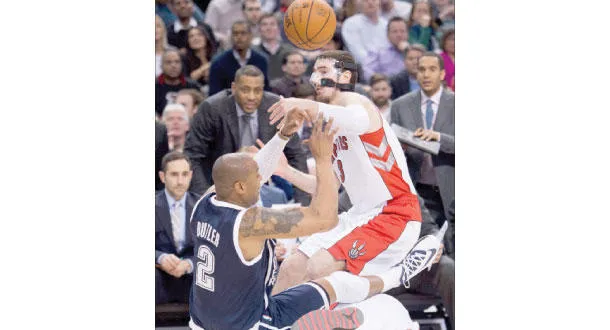 لاعبان من تورنتو وأوكلاهوما يصطدمان ببعضهما خلال المواجهة التي جمعتهما في دوري السلة الأمريكي (أ.ف.ب)
