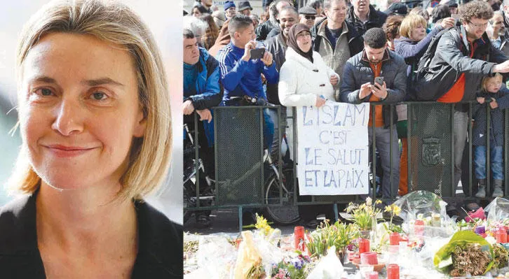 آلاف من الأشخاص في مسيرة وصفت بأنها «ضد الإرهاب والكراهية» في العاصمة بروكسل أول من أمس (أ.ف.ب) - منسقة السياسة الخارجية والأمنية بالاتحاد الأوروبي فيديريكا موغيريني تتحدث للصحافيين في لوكسمبورغ أمس (إ.ب.أ)