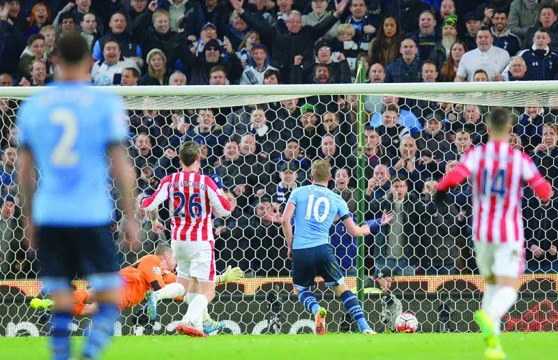 كين نجم توتنهام (رقم 10) يسجل هدفه الثاني من رباعية فريقه في مرمى ستوك (أ.ف.ب)