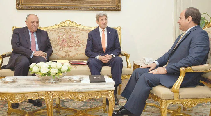 الرئيس السيسي لدى استقباله وزير الخارجية الأميركي جون كيري بحضور سامح شكري وزير الخارجية المصري في القاهرة أمس (إ.ب.أ)