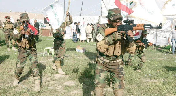 ميليشيا «عصائب أهل الحق» الشيعية التي تقاتل في سوريا دفاعا عن نظام الرئيس بشار الأسد تستعرض في كربلاء بصورة علنية أمس (رويترز)