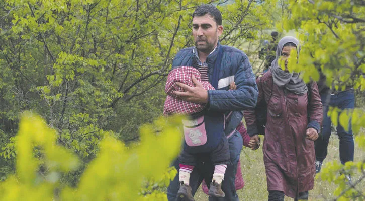 لاجئون سوريون يعبرون الحدود اليونانية ــ المقدونية بالقرب من مدينة غيفيغليا أول من أمس (أ.ف.ب)