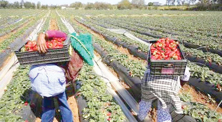 مزارعون مغاربة يلتقطون حبات الفراولة من إحدى المزارع (رويترز)