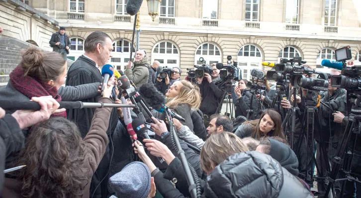 ممثلو وسائل الإعلام البلجيكية يتحلقون حول فرانك بيرتون محامي صلاح عبد السلام المطلوب الأمني الأبرز عقب ترحيله إلى فرنسا أول من أمس (إ.ب.أ)
