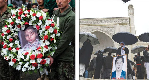 عائلة وأقارب الصحافي الأفغاني سردار أحمد يحتشدون أمام مسجد عيد غاه في العاصمة كابل في انتظار خروج جثمانه قبل دفنه في مقبرة العائلة أمس (أ.ف.ب) - جنود أفغان يحملون صورة عمر نجل الصحافي الأفغاني سردار أحمد الذي قتل أيضا مع والده في هجوم لطالبان (أ.ف.ب)