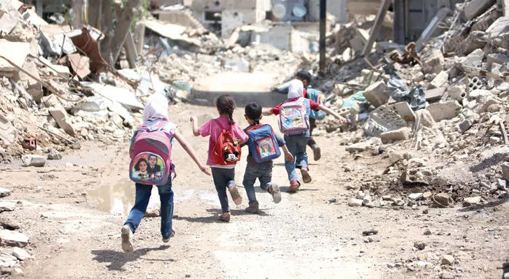أطفال سوريون في طريقهم إلى المدرسة وسط أنقاض أحد الاحياء وسط دمشق (أ.ف.ب)