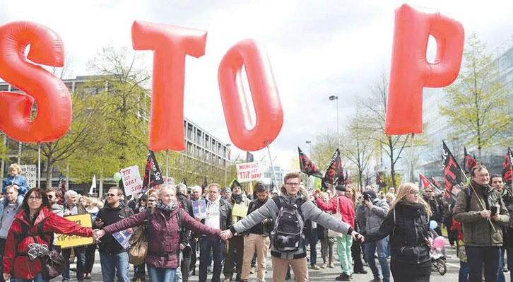 شهدت العديد من المدن الألمانية مظاهرات حاشدة تنديدًا باتفاقية الشراكة عبر الأطلسي خلال زيارة الرئيس أوباما إلى ألمانيا (رويتز)