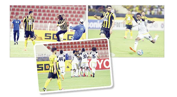 مختار فلاتة يقود هجمة اتحادية ضد سباهان و لاعبو الاتحاد يحتفلون بهدفهم الأول في الشباك الإيرانية و مشجع اتحادي اقتحم ملعب المباراة لمعانقة اللاعب جمال باجندوح (تصوير: مشعل القدير)