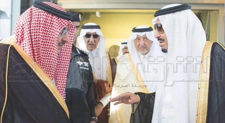 خادم الحرمين الشريفين في حديث مع الأمير محمد بن نايف ولي العهد الذي كان في مقدمة مستقبليه لدى وصوله إلى جدة ويبدو الأمير خالد الفيصل أمير منطقة مكة المكرمة (تصوير: بندر الجلعود)