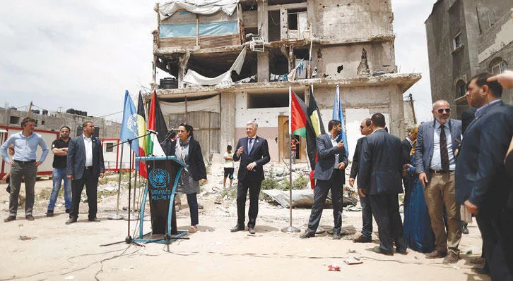 وزير الخارجية البلجيكي في حارة الشجاعية شرقي غزة التي دمر العدوان الإسرائيلي عام 2014 معظمها (أ.ف.ب)