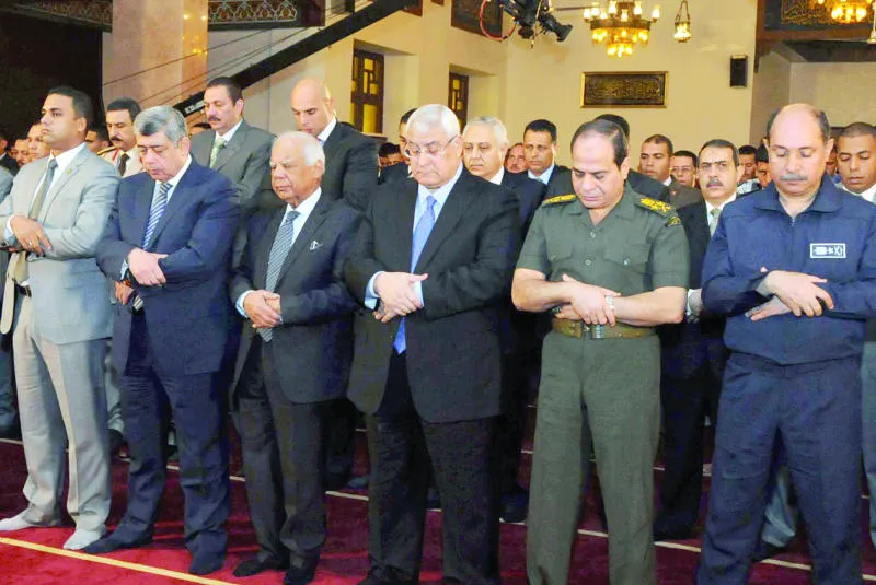 وفيما أدى الرئيس المؤقت عدلي منصور ورئيس الوزراء الدكتور حازم الببلاوي ووزيرا الدفاع عبد الفتاح السيسي والداخلية محمد إبراهيم، صلاة العيد بمسجد قيادة القوات الجوية بالقاهرة وسط حراسة أمنية مشددة، احتشد ملايين المصريين أمس في الساحات والمساجد التي سبق وحددتها وزارة الأوقاف في مختلف محافظات الجمهورية لأداء صلاة عيد الأضحى، بعد أن أغلقت القوات المسلحة بالتعاون مع قوات الشرطة ميادين التحرير ورابعة العدوية ومصطفى محمود ونهضة مصر ومحيط قصر الاتحادية الرئاسي بشكل كامل؛ تحسبا لمسيرات جماعة الإخوان ومنعا لأي اعتصامات فيها.