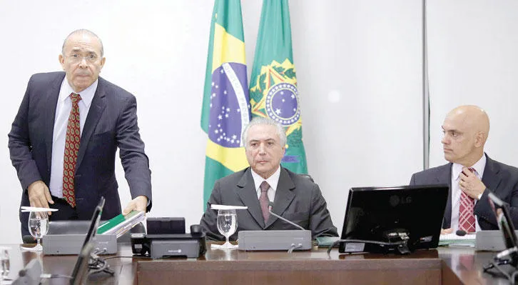 رئيس البرازيل الانتقالي ميشال تامر يترأس اجتماعًا بحضور مسؤولي الدفاع أول من أمس في برازيليا (رويترز)