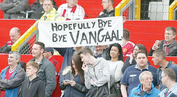جماهير يونايتد حملت لافتات تطالب فيها برحيل فان غال (رويترز)