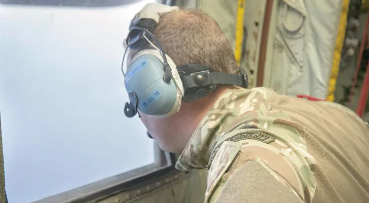 ضابط في البحرية البريطانية ينظر عبر نافذة طائرة للنقل العسكري من طراز «سي-130 هيركوليس» خلال عملية بحث عن الطائرة المصرية المنكوبة في شرق المتوسط (إ.ب.أ)