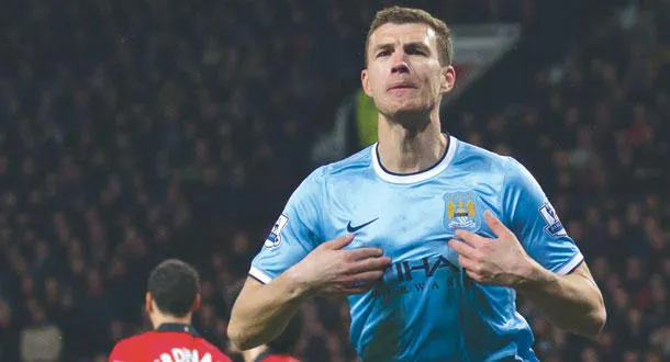 دزيكو نجم سيتي يحتفل بهدفيه في مرمى يونايتد (أ.ب)