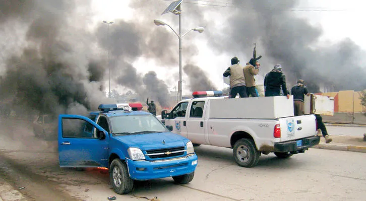 عناصر من تنظيم داعش يستخدمون سيارة خاصة بالشرطة العراقية استولوا عليها في مدينة الفلوجة بعد إحراق مقر الشرطة هناك (أ.ب)