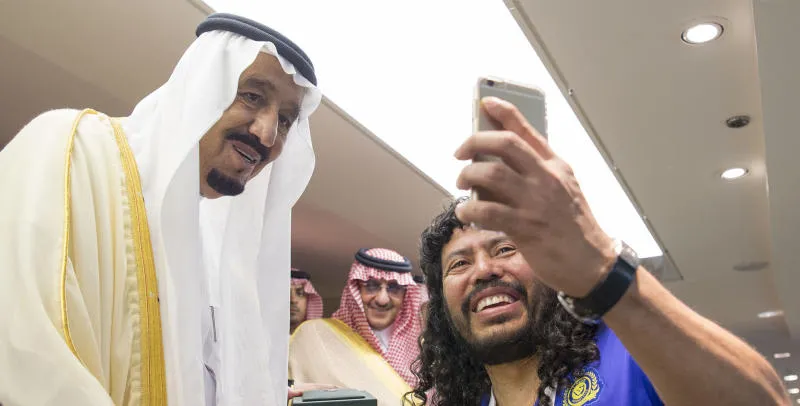 وكان الحارس العالمي المعتزل قد انتهز الفرصة، وطلب من خادم الحرمين التقاط صورة تجمعهما بجواله الخاص، الأمر الذي قوبل بالترحيب من راعي المباراة، وسط فرحة غامرة من الحارس الكولومبي المعتزل الذي نسي فيما يبدو آلام الخسارة، والخروج خالي الوفاض من الموسم الحالي.