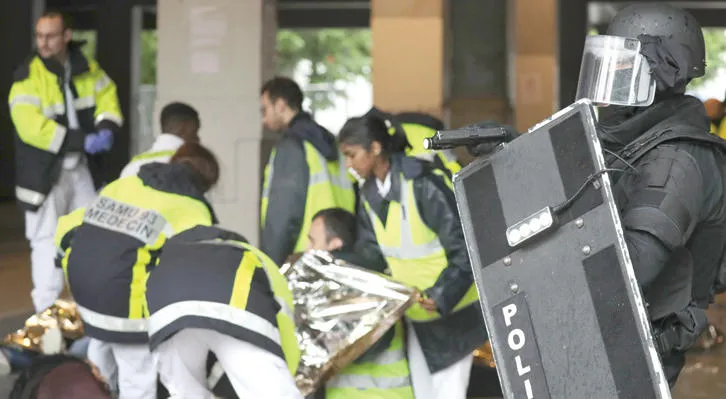 أفراد في وحدة التدخل الخاص والشرطة والإسعاف يشاركون في تدريب على مكافحة الإرهاب استعدادا لبطولة كرة القدم للأمم الأوروبية في باريس أمس (أ.ف.ب)
