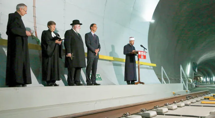 رجال دين يمثلون الديانات الثلاث خلال حفل افتتاح أطول نفق للسكك الحديدية (إ.ب.أ)