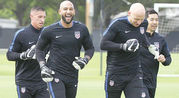 الحارس الأميركي تيم هاوارد (يسار) خلال تدريب منتخب الولايات المتحدة (أ.ب)