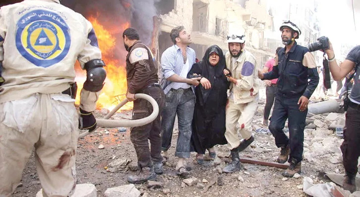 قوات الدفاع المدني تساعد امرأة من ضحايا غارتين جويتين بالبراميل المتفجرة على حي الشعار صباح أمس (مركز حلب الإعلامي)