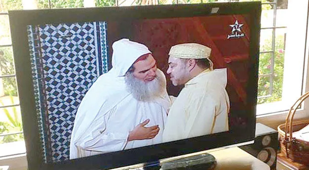 صورة تلفزيونية للملك محمد السادس وهو يتحدث مع خطيب مسجد طارق بن زياد في طنجة الشيخ السلفي محمد الفزازي المفرج عنه بعفو ملكي (الشرق الاوسط)