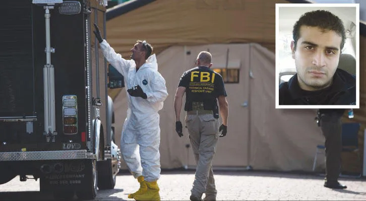 عمر متين «نيويورك تايمز» - محققو «إف بي آي» يجمعون الأدلة الجنائية من موقع المذبحة في أورلاندو (أ. ف.ب)