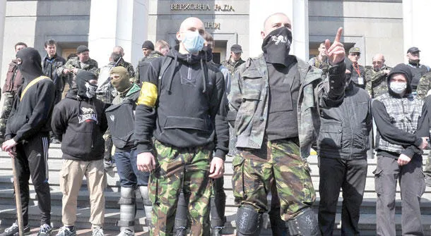 مؤيدون لحركة «برافي سيكتور» اليمينية المتطرفة يتظاهرون أمام البرلمان في كييف أمس، مطالبين باستقالة وزير الداخلية غداة مقتل أحد قادة الحركة برصاص الشرطة (أ.ف.ب)