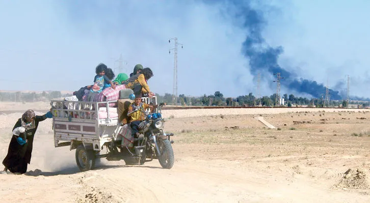حيث يقول مهدي صالح عابد، 94 عاما، وهو يجلس في ظل خيمة من الخيام إن «الحياة هنا أشبه بالسجن. ولكن الحياة هنا في الغبار والأتربة أفضل بكثير من الحياة مع (داعش)». كانت إحدى الهيئات الإغاثية قد قامت بتسليم مائة ألف رطل من المواد الغذائية، مع انتشار الغبار خلال الصفوف الجرداء من الخيام في الصحراء أثناء اصطفاف الناس من أجل تسلم نصيبهم منها – ولكن العائلات هناك تفتقر إلى أساسيات الحياة مثل المواقد المحمولة حتى يمكنها الاستفادة من أكياس الدقيق والأرز التي يتلقونها من الهيئات الإغاثة.