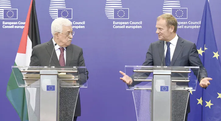 رئيس مجلس الاتحاد الأوروبي دونالد تسك والرئيس الفلسطيني محمود عباس خلال مؤتمرهما الصحافي المشترك في بروكسل (أ.ف.ب)