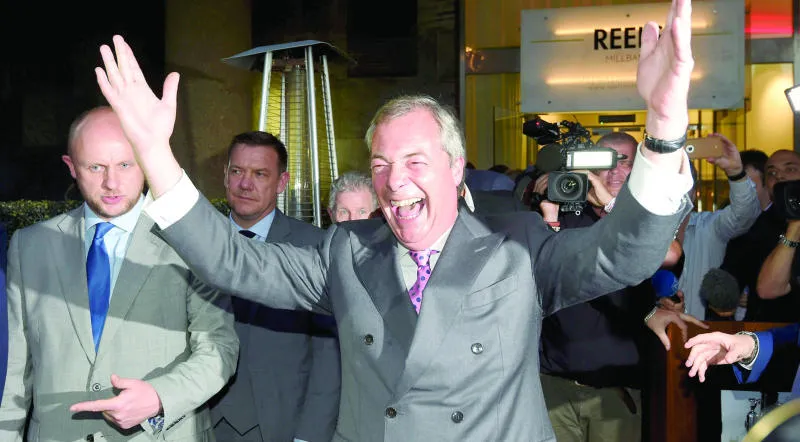 زعيم حزب الاستقلال نايجل فراج يحتفل بنتائج الاستفتاء في لندن أمس (رويترز)