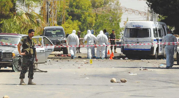 عناصر من الجيش اللبناني ومفتشي الطب الشرعي يعاينون موقع الهجمات الانتحارية في بلدة القاع اللبنانية على الحدود مع سوريا أمس (رويترز)