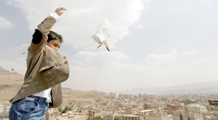 طفل يمني يطلق حمامة في الهواء لدفع اليمنيين في مشاورات الكويت للتوصل إلى اتفاق للسلام (رويترز)
