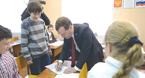 رئيس الوزراء الروسي ديمتري ميدفيديف لدى لقائه طلاب مدرسة في سيمفروبول عاصمة القرم أمس (أ.ف.ب)