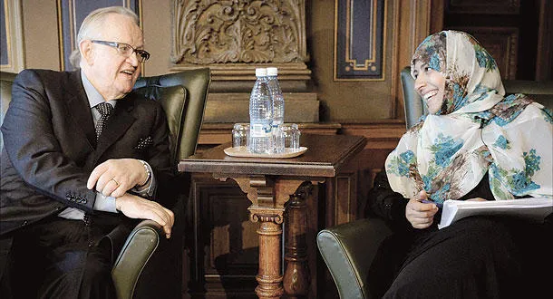 الرئيس الفنلندي السابق يتحدث إلى توكل كرمان الحائزة جائزة نوبل لسلام 2011 خلال مؤتمر للحوار في هلسنكي أمس (رويترز)