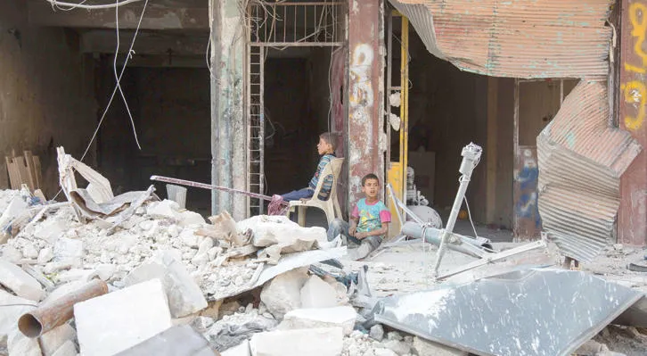 أطفال سوريون يجلسون بين أنقاض بناية تعرضت للقصف في حلب في وقت يكثر فيه الحديث عن تورط إيران في المأساة السورية (أ.ف.ب)