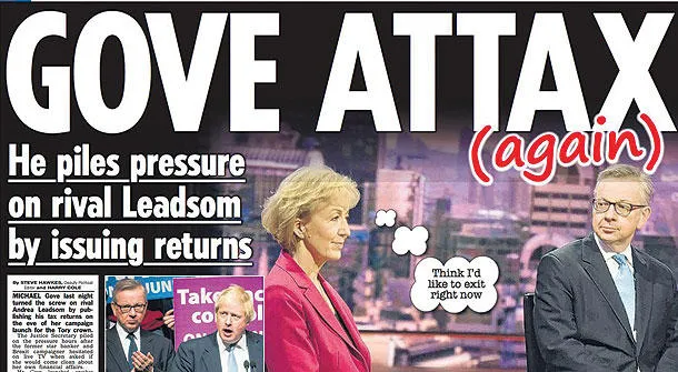 وبمزيد من الأهمية، سبب مايكل غوف حرجا كبيرا لأندريا ليدسوم بنشره إقراراتها الضريبية. مما دعا صحيفة «ديلي ميل» إلى التساؤل ما إذا كان ذلك سوف يعصف بمحاولات ليدسوم للحصول على منصب القيادة، وكما أشارت صحيفة «ذا صن» إلى أنه تصرف من شأنه عرقلة الزخم الكبير وراء حملتها الانتخابية. ولكن لماذا؟ بسبب، كما كتب آندي ماكسميث من صحيفة «الإندبندنت»، أن صحيفته كشفت في أبريل (نيسان) من عام 2014 عن أن هناك شركة أسستها السيدة ليدسوم برفقة زوجها استخدمت صناديق مالية مثيرة للجدل في تخفيض فاتورة الضرائب على الميراث عن طريق الاستفادة من الترتيبات المصرفية في الخارج.