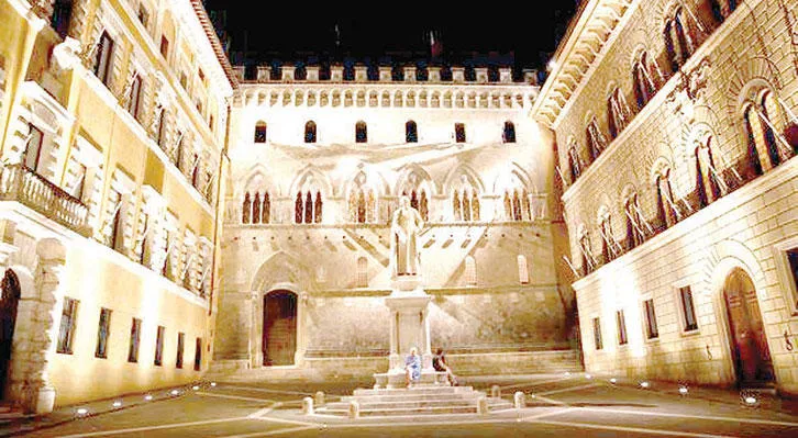 مدخل بنك مونتي دي باشي دي سيينا في إيطاليا وهو أقدم المصارف العاملة في العالم (رويترز)