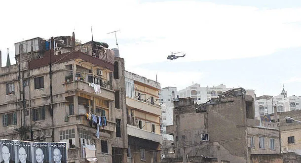 هليكوبتر تحلق في سماء طرابلس أمس وسط إجراءات أمنية اتخذها الجيش اللبناني لإعادة الاستقرار إلى المدينة (أ.ف.ب)