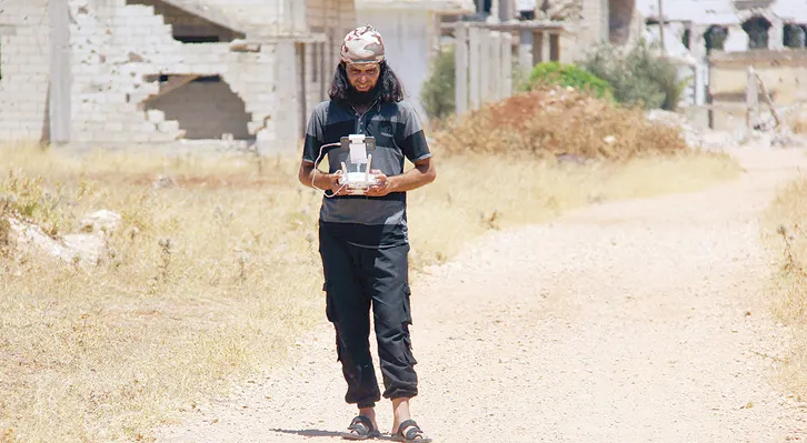مقاتل يجرب طائرة من دون طيار (درون) صغيرة في إحدى المناطق القليلة الخاضعة لسيطرة المعارضة السورية في حمص أمس (أ.ف.ب)