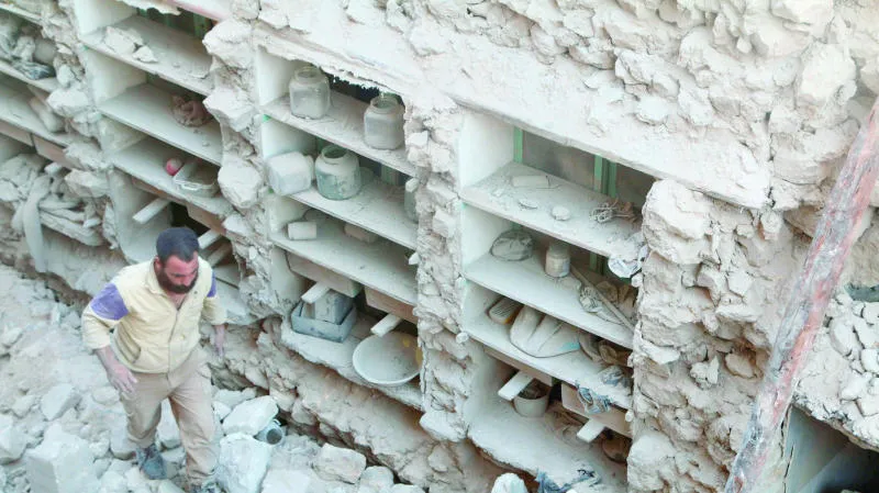 أحد رجال الإغاثة يبحث عن ناجين وسط الأنقاض في أحد أحياء حلب أمس (رويترز)
