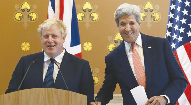 وزير الخارجية البريطاني بوريس جونسون في مؤتمر صحفي مشترك مع نظيره الأميركي جون كيري في لندن أول من أمس (أ.ف.ب)