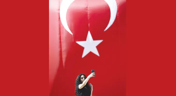 شابة تركية تلتقط صورة لعلم بلادها في جامعة اسطنبول أمس (إ.ب.أ)