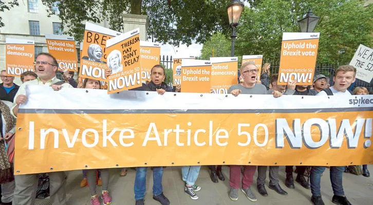 متظاهرون بريطانيون أمام مقر رئيسة الوزراء الجديدة يطالبونها بتفعيل المادة 50 فورا (أ.ف.ب)