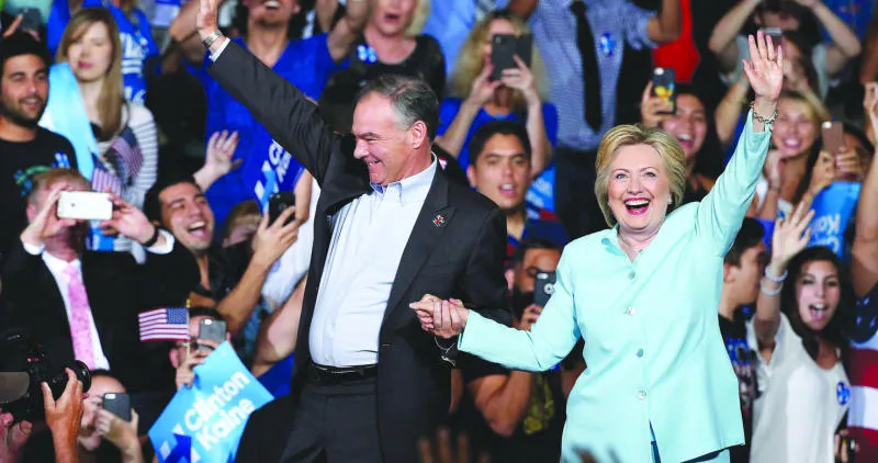 المرشحة الديمقراطية هيلاري كلينتون تقدم مرشحها لمنصب نائب الرئيس السيناتور تيم كين أول من أمس في فلوريدا (إ.ب.أ)